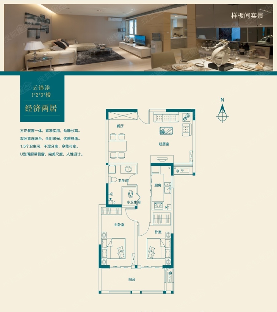 卧室:双卧直连阳台,全明采光。 厨房:U型明厨带侧窗,完美尺度。 客厅:方正餐客一体,紧凑实用。